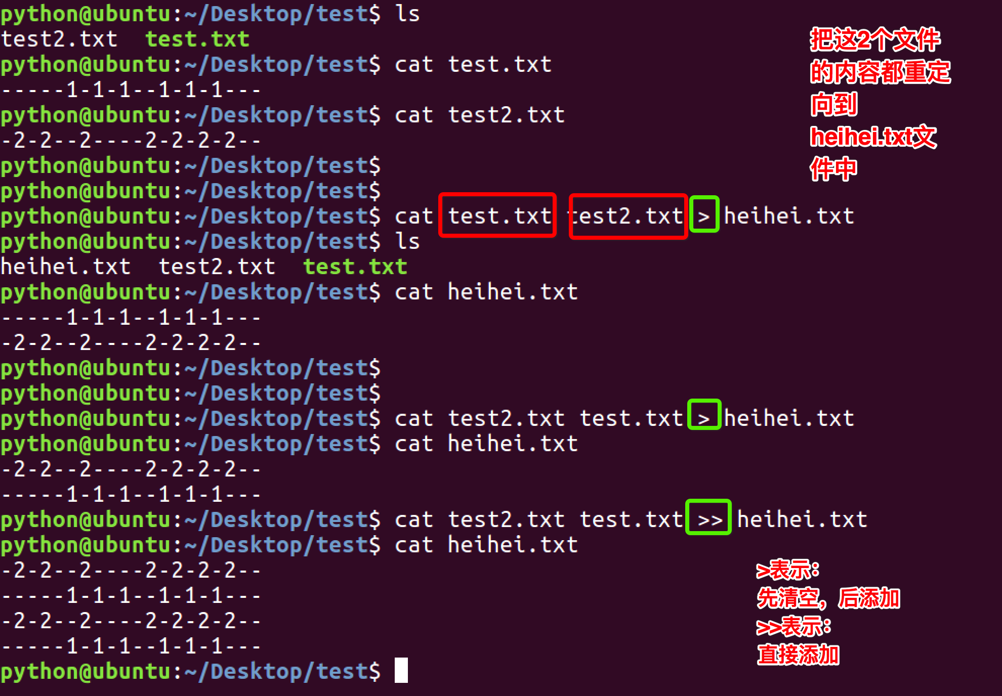 >输出重定向会覆盖原来的内容,>>输出重定向则会追加到文件的尾部。