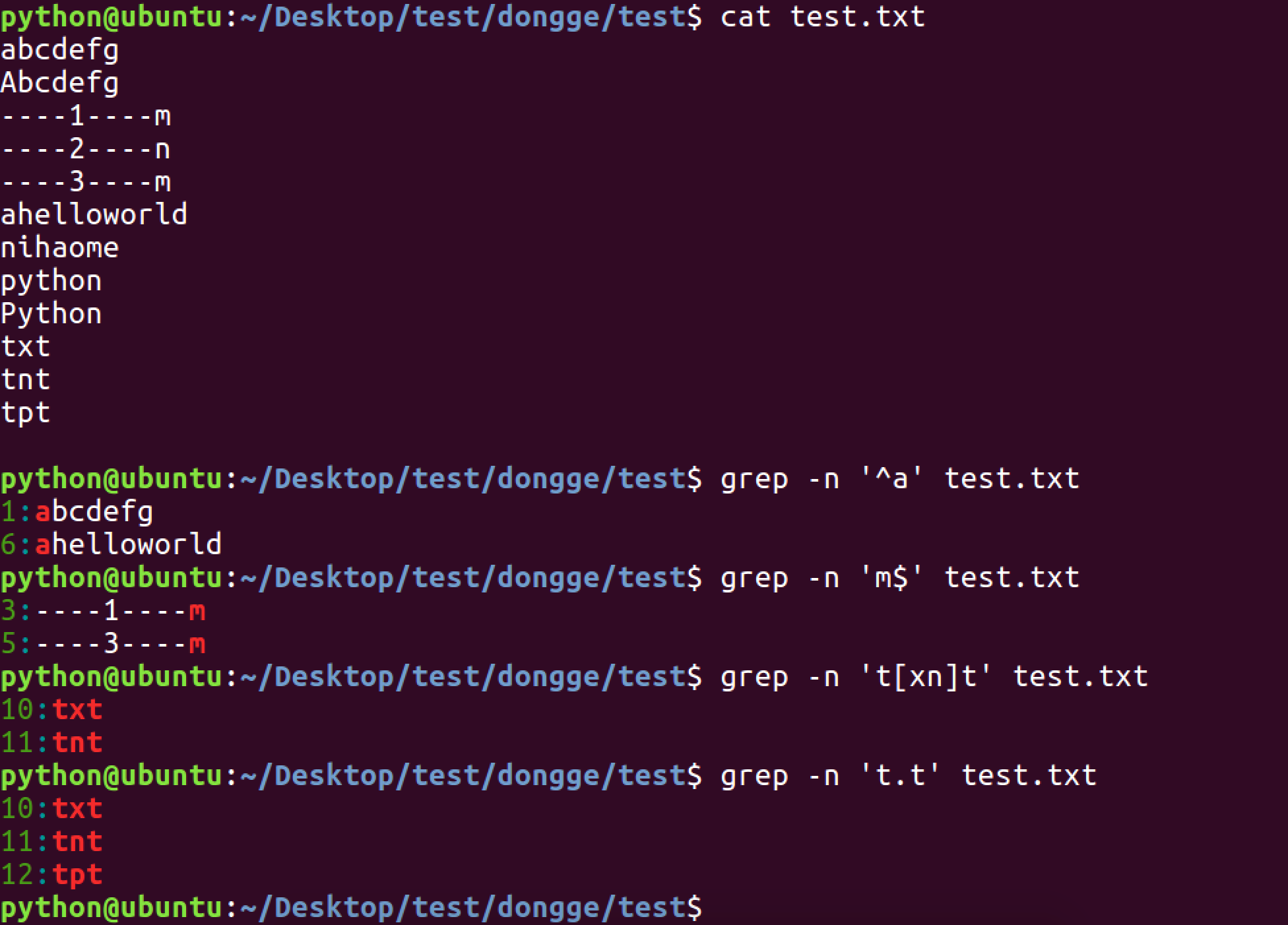 | ke$ | 行尾,搜寻以 ke 结束的行;grep -n 'ke$' 1.txt |